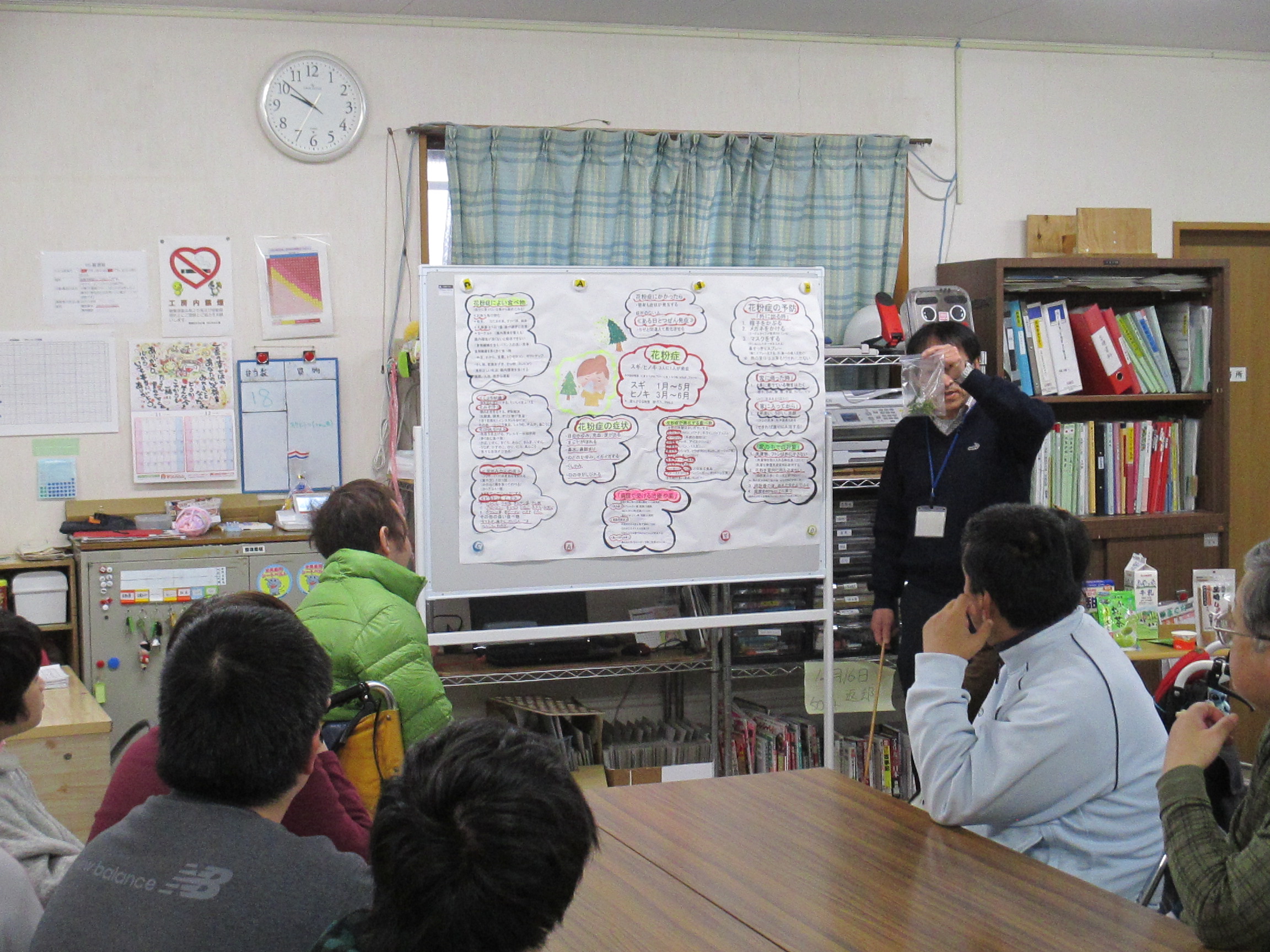 花粉症について学びました! Posted on 2017年12月5日 by さわやか さわやか工房では、安全や衛生に関すること、 例えば避難訓練、交通安全、健康に関することなどを毎月テーマを 決めて実施しています。 今回は花粉症について、職員が講師となり、利用者、職員が一緒に学びました。