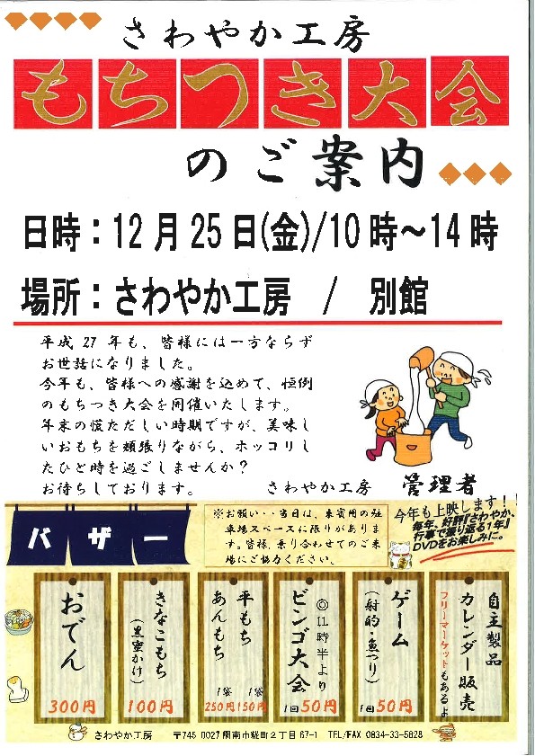 カレンダーのご注文は、さわやか工房(TEL 0834-33-5828)まで。